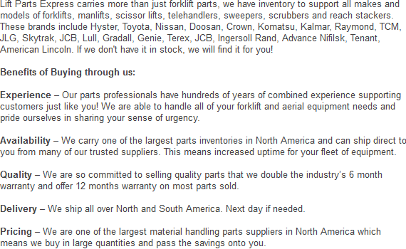 We have first-rate prices on all our forklift parts. For a quote on a part or attachment we offer, please contact us at: